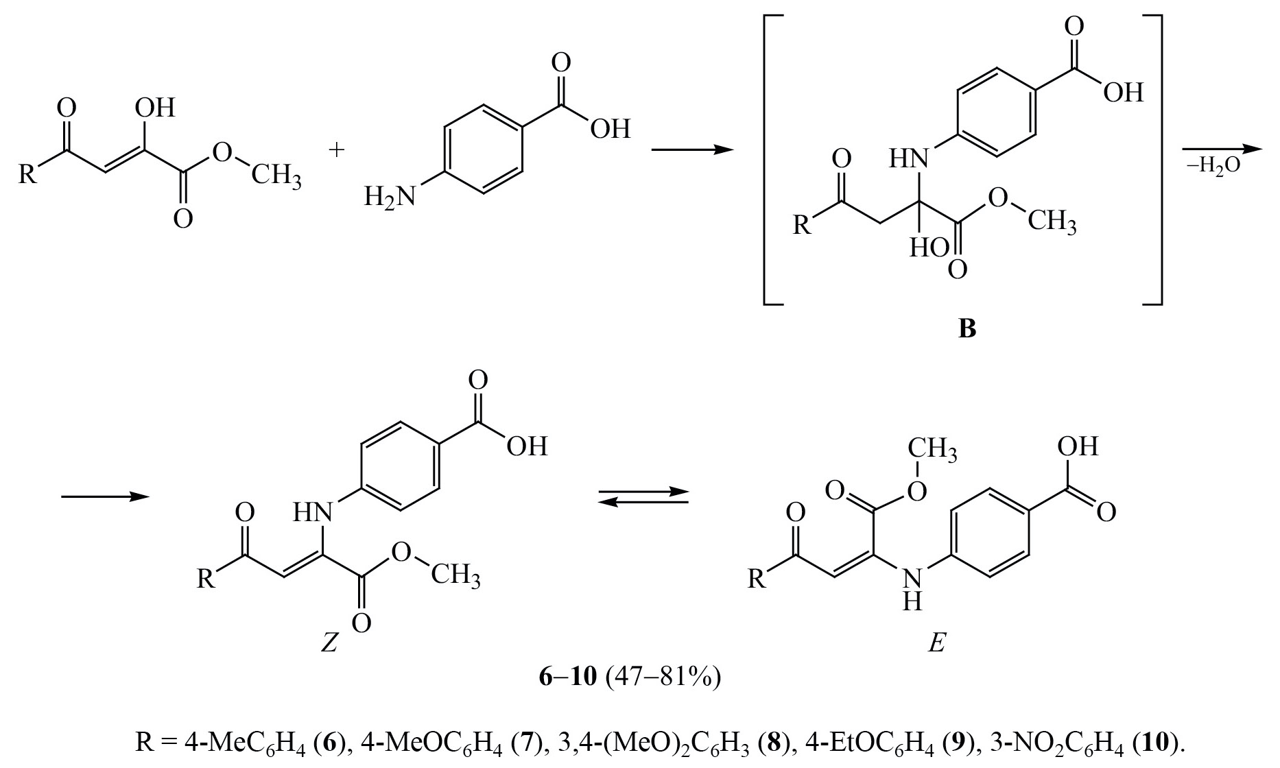 В продолжение изучения реакции метиловых эфиров ароилпировиноградных кислот с 4-аминобензойной кислотой установлено, что направление реакции зависит от условий проведения. Так, при кипячении вышеуказанных реагентов в смеси уксусная кислота–этанол в соотношении 1:1 в течение 10 мин без добавления безводного ацетата натрия образуются 4-{[(2Z)-4-арил-1-метокси-1,4-диоксобут-2-ен-2-ил]амино}бензойные кислоты 6–10 (схема 3). Реакция протекает по механизму, описанному ранее [19, 20]. На первой стадии ароматическая аминогруппа пара-аминобензойной кислоты присоединяется по двойной связи α-карбонильной группы исходного метилового эфира ароилпировиноградной кислоты с образованием промежуточного соединения В (карбиноламина), дегидратация которого приводит к соединениям 6–10 (cхема 3).