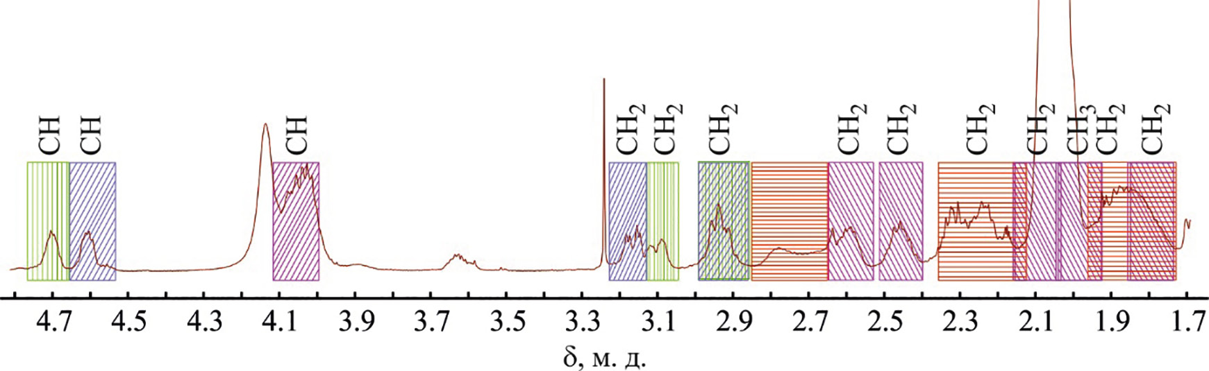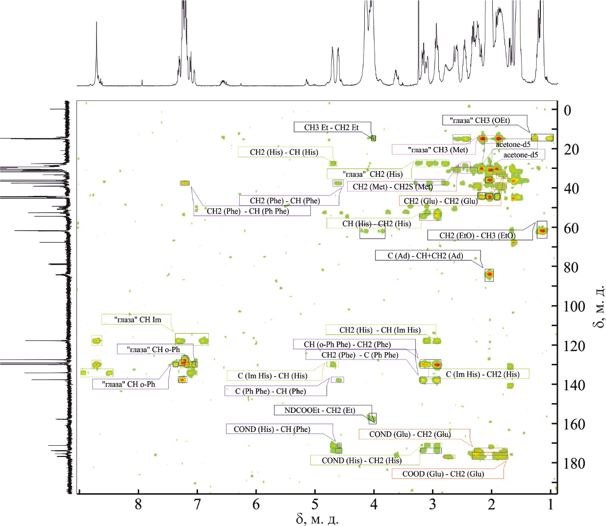Рис. 4. Фрагмент спектра ЯМР 1H (500.2 МГц) тетрапептида 1 в смеси ацетон-d6–D2O (8:2, об.). Зеленым отмечены сигналы гистидина, синим – фенилаланина, красным – псевдоглутамина, сиреневым – псевдометионина.