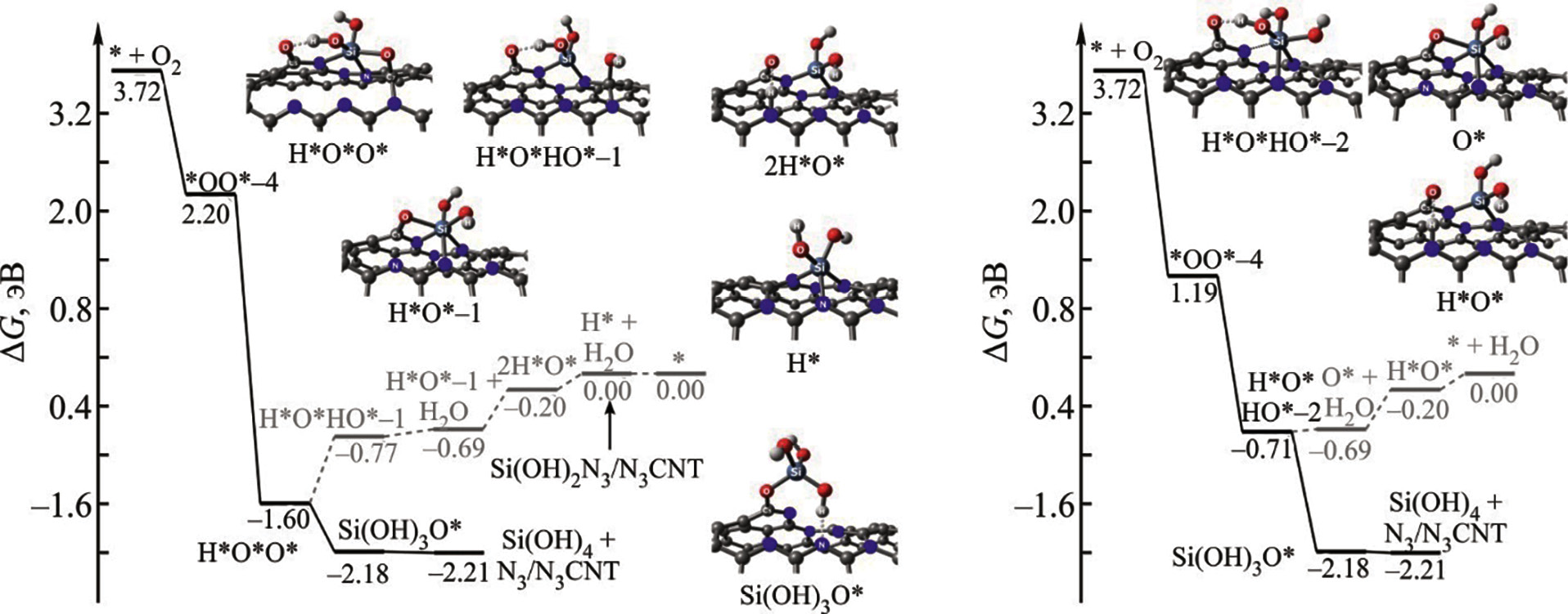 Моделирование начальной стадии реакции восстановления кислорода показало, что адсорбция молекулярного кислорода на положительно заряженный Si-центр модельных нанотрубок SiN3/CNT и SiN3/N3CNT протекает высоко экзоэргично и приводит к образованию исключительно O2* (* – активный центр катализатора) адсорбатов по типу Гриффита, 1,2,3-диоксасилиранов (рис. 3). В результате протонирования, сопряженного с переносом первого электрона, одного из атомов кислорода 1,2,3-диоксасилиранового фрагмента O2* происходит разрыв связи O–O и образование гидроксисиланона O*HO* на обеих нанотрубках, что исключает протекание реакции восстановления кислорода по 2e/4e-ассоциативному маршруту реакции восстановления кислорода на Si-центре. Попытки принудительной оптимизации перокси-адсорбата HOO* приводили к спонтанной изомеризации в адсорбат O*HO*. Последний выступает в качестве стабильного продукта реакции восстановления кислорода при величине электродного потенциала U > 0.85 В, что соответствует перенапряжению реакции восстановления кислорода h < 0.38 В на модельном катализаторе SiN3/CNT (U > 0.3 В, h < 0.93 В на SiN3/N3CNT). При высоких величинах перенапряжения h гидроксисиланон O*HO* самопроизвольно (DG < 0) восстанавливается до силандиола 2HO*, тогда как последующие стадии каталитического цикла реакции восстановления кислорода сопряжены с повышением свободной энергии системы и, поэтому, Si-центр оказывается необратимо отравлен.