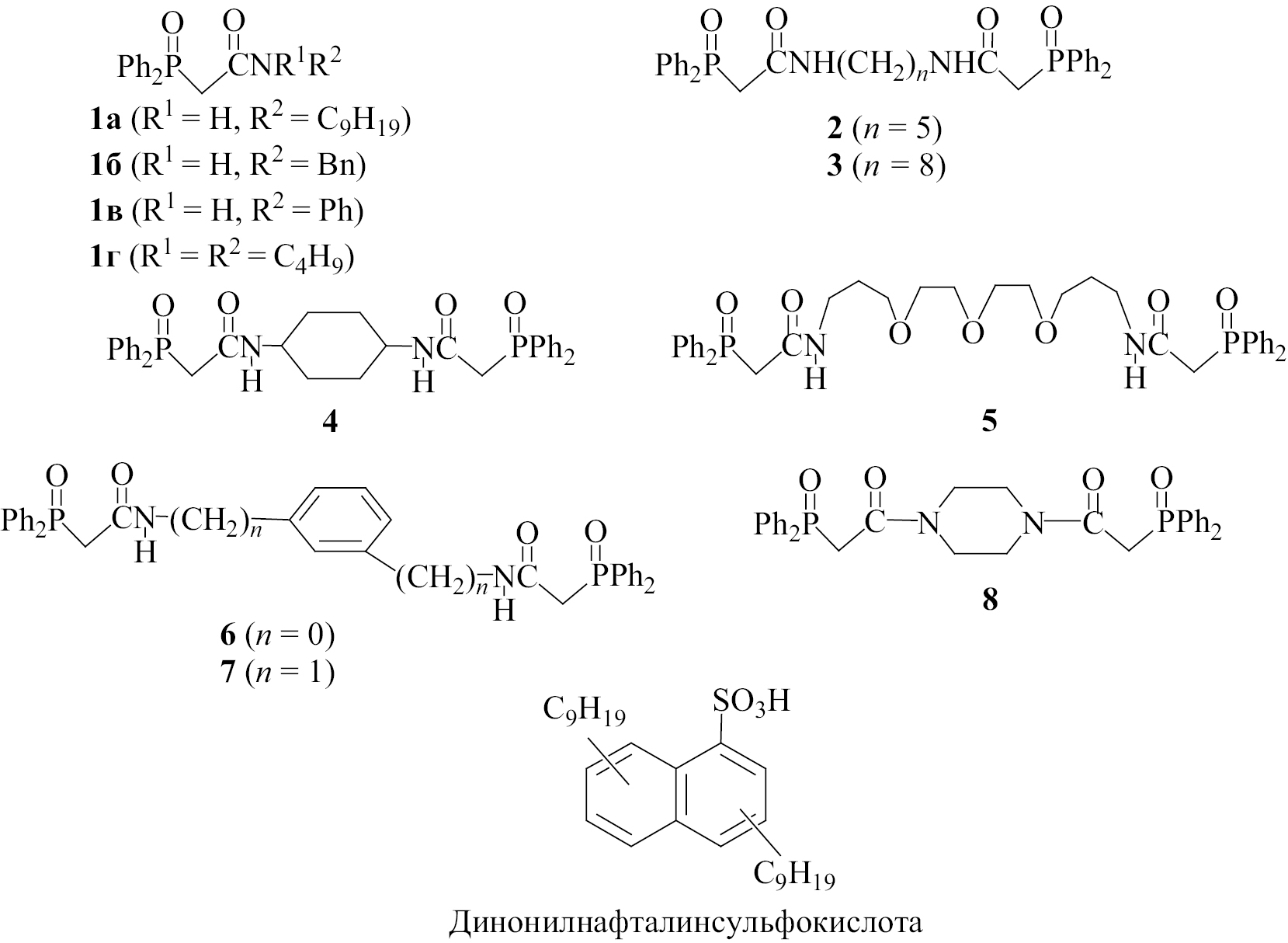 Соединения 1а [34], 1б, в, 6, 7 [35], 1г [36], 2, 3 [37], 5 [13] и 8 [38] получены по описанным ранее методикам. Динонилнафталинсульфокислоту (Sigma-Aldrich) очищали по методике [39]. В качестве органических растворителей использовали нитробензол, 1.2-дихлорэтан, хлороформ и о-ксилол марки ХЧ без дополнительной очистки. Растворы экстрагентов в органических растворителях готовили по точным навескам.