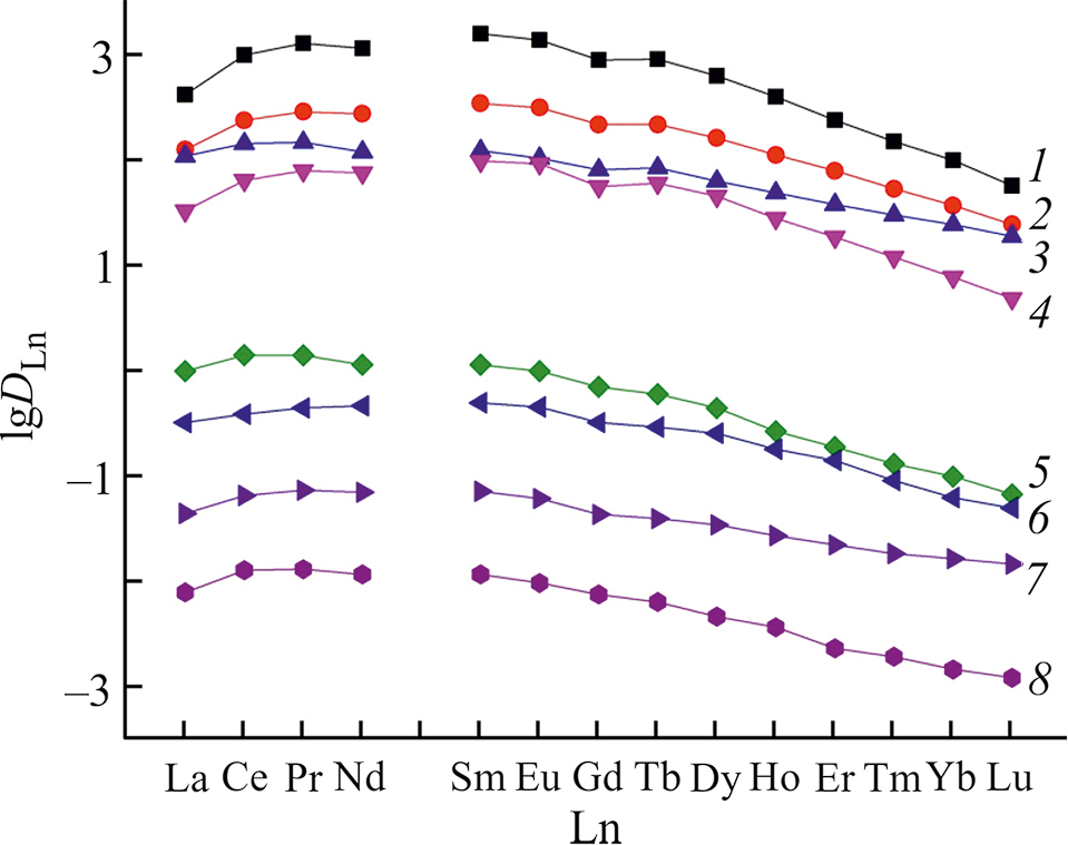Природа фрагмента, соединяющего координирующие группы, оказывает определенное влияние на экстракционную способность бискарбамоилметилфосфиноксидов по отношению к ионам Ln(III) в азотнокислых средах в присутствии динонилнафталинсульфокислоты. Увеличение расстояния между координирующими группами молекулы экстрагента приводит к снижению величин DLn для большинства Ln(III) в ряду соединений 3 < 2 < 4 и 7 < 6 (рис. 4). Соединение 5 с полиэфирным мостиком между группами Ph2P(O)CH2C(O)NH экстрагирует Ln(III) более эффективно, чем соединение 3 с алкиленовым мостиком. В системе с соединением 8, в молекуле которого координирующие карбамоильные группы заблокированы жестким пиперазиновым фрагментом, кооперативный эффект не проявляется. Величины DLn в системе с этим реагентом заметно ниже, чем в системе с соединением 1а (рис. 4).