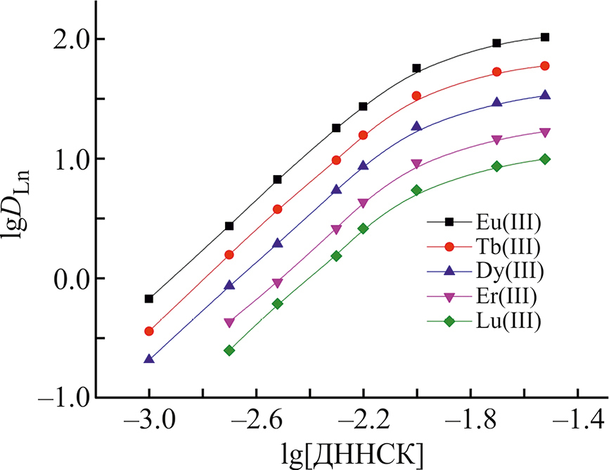 Увеличение концентрации динонилнафталинсульфокислоты в органической фазе сопровождается увеличением коэффициентов распределения Ln(III) (рис. 6). При экстракции из растворов 3 моль/л HNO3 угловой наклон линейного участка зависимости lgDLn–lg[ДННСК] близок к 2, что соответствует переходу ионов Ln(III) в органическую фазу в виде комплексов, включающих два аниона динонилнафталинсульфокислоты. При концентрации динонилнафталинсульфокислоты >0.01 моль/л ее увеличение менее заметно влияет на увеличение DLn. Одной из причин этого может быть образование аддуктов между карбамоилметилфосфиноксидом и кислотным экстрагентом в органической фазе [22], что приводит к снижению концентрации свободного экстрагента в органической фазе.