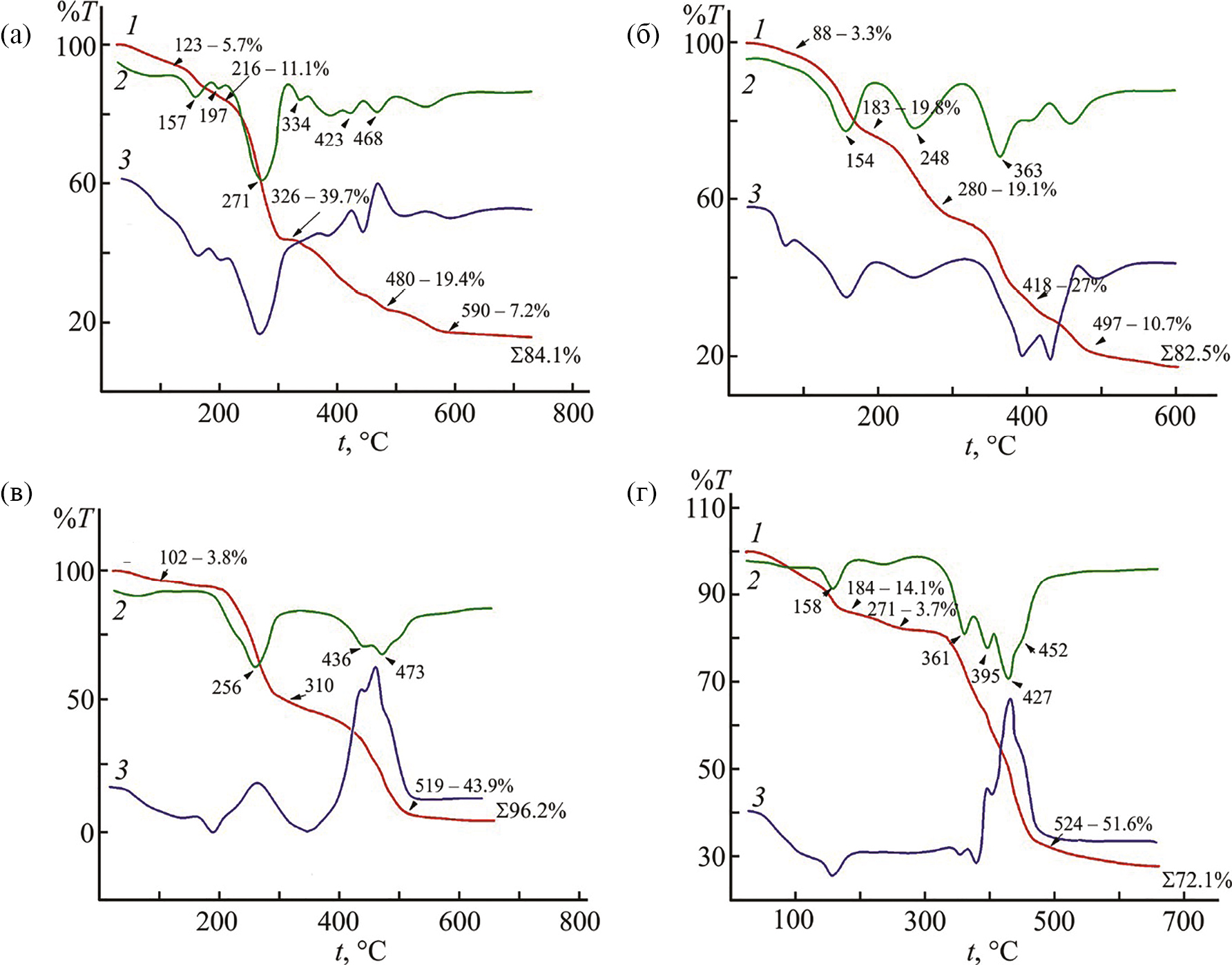 Термогравиметрический анализ разнолигандных комплексных соединений европия(III) c пиразиновой кислотой был проведен в интервале температур 30–800°С. На рис. 3 изображены кривые ТГ, ДТГ и ДТА синтезированных пиразинатов европия(III). На основании полученных кривых можно сделать вывод, что термическое разложение комплексных соединений происходит сложно – в несколько этапов, и сопровождается рядом эндо- и экзотермических эффектов.