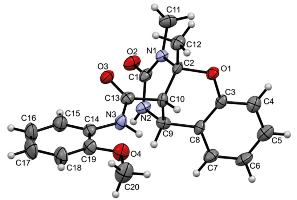 Соединение 3: триклинная сингония, пространственная группа P-1, C20H21N3O4, M = 367.40, a = 9.447(4) Å, b = 12.771(3) Å, c = 15.889(4) Å, α = 89.973(19)°, β = 84.73(3)°, γ = 83.67(3)°, V = 1897.1(10) Å3, Z = 4, dвыч = 1.286 г/см3, μ = 0.091 мм–1. Окончательные параметры уточнения: R1 = 0.1014 [для 2423 отражений с I > 2σ(I)], wR2 = 0.2704 (для всех 8879 независимых отражений, Rint = 0.1077), S = 0.996. Результаты РСА зарегистрированы в Кембриджском центре кристаллографических данных под номером CCDC 2390525.