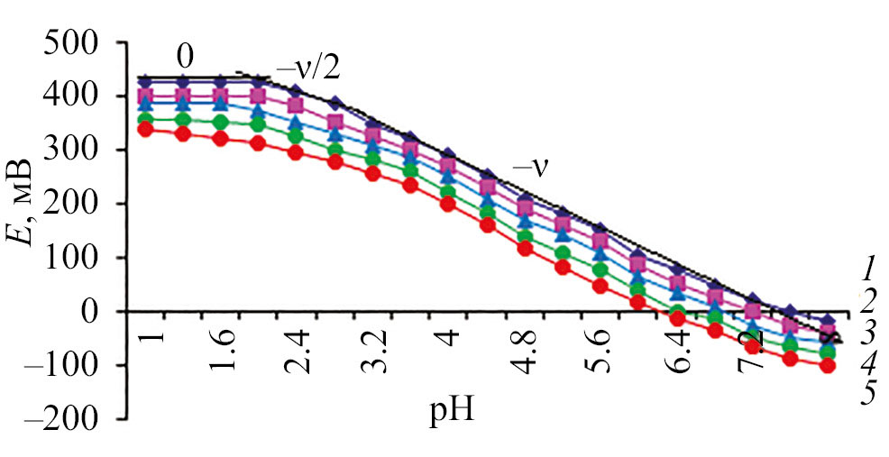 Согласно теории метода оксредметрии, последовательное формирование линейных участков с тангенсами углов наклона, равными 0, –ν/2, –ν, свидетельствует о ступенчатом комплексообразовании Fe(II). Зависимости Е–рН позволяют определить общее количество координированных лигандов вокруг центрального иона комплексообразователя.