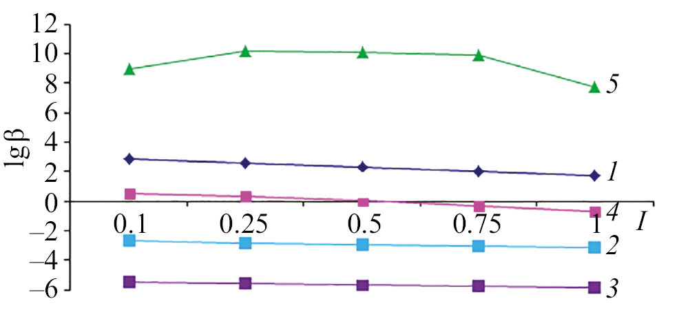 Известно, что зависимость концентрационной константы равновесия координационных соединений от ионной силы раствора выражается по теории Дебая–Хюккеля [11]. Полученные прямые линии при экстраполяции на нулевое значение ионной силы дают отрезки на оси ординат, численно равные lgβ0 (табл. 3). Угловой коэффициент полученных кривых позволил определить величину эмпирической константы b, которые приведены в табл. 3.