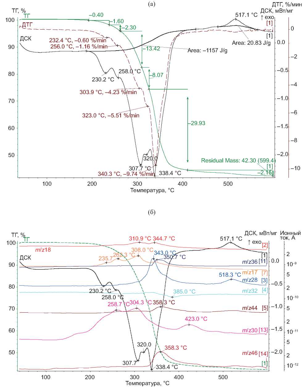 Термогравиметрический анализ (ТГА) показал три хорошо разделенные стадии уменьшения массы с минимумами на кривой ДТГ (213.3, 241.1, 302.9°С), сопровождающиеся эндотермическими эффектами, отмеченными на кривой ДСК практически при тех же температурах (217.6, 244.6, 306.3°С). Слабый экзоэффект без потери масс зафиксирован при 307°С (рис. 1а).