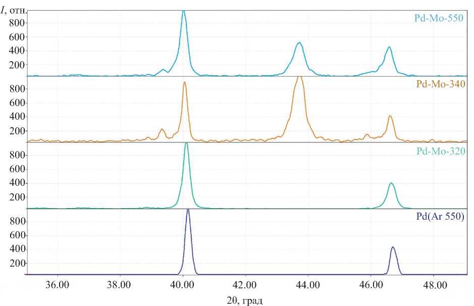 На рис. 3 представлено наложение дифракционных спектров палладия, полученного нами в ходе термического разложения исходного [Pd(NH3)4]Cl2, и промежуточных продуктов термолиза смеси [Pd(NH3)4]Cl2–(NH4)6Mo7O24 (Pd:Mo = 12:7) при разных температурах.