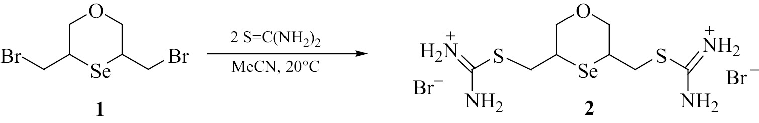 Бисизотиурониевая соль 3,5-бис(бромметил)-1,4-оксаселенана (2). К раствору тиокарбамида (0.152 г, 2 ммоль) в СН3СN (5 мл) при перемешивании добавляли раствор 3,5-бис(бромметил)-1,4-оксаселенана (0.34 г, 1 ммоль) в СН3СN (1 мл). Смесь перемешивали при комнатной температуре в течение 18 ч. Осадок отделяли и промывали охлажденным СН3СN. Выход 0.490 г (99%), белый порошок. Спектр ЯМР 1Н (D2O) δ, м. д.: 4.65–4.71 м (8H, NH), 4.09–4.15 м (2H, CHSe), 4.03 д (2H, CH2S JHH 5.0 Гц), 3.99 д (2H, CH2S, JHH 5.5 Гц), 3.33–3.30 м (4H, OCH2). Cпектр ЯМР 13С (D2O) δС, м. д.: 31.20 (CHSe), 31.22 (CHSe), 33.93 (CH2S), 35.27 (CH2S), 71.74 (OCH2), 71.85 (OCH2), 170.49 (С), 170.51 (C). Найдено, %: C 19.97; H 3.15; Вr 33.02; N 11.41; S 12.96; Se 16.48. C8H18Вr2N4ОS2Se (М 487.13). Вычислено, %: C 19.72; H 3.31; Вr 32.81; N 11.50; S 13.17; Se 16.21.