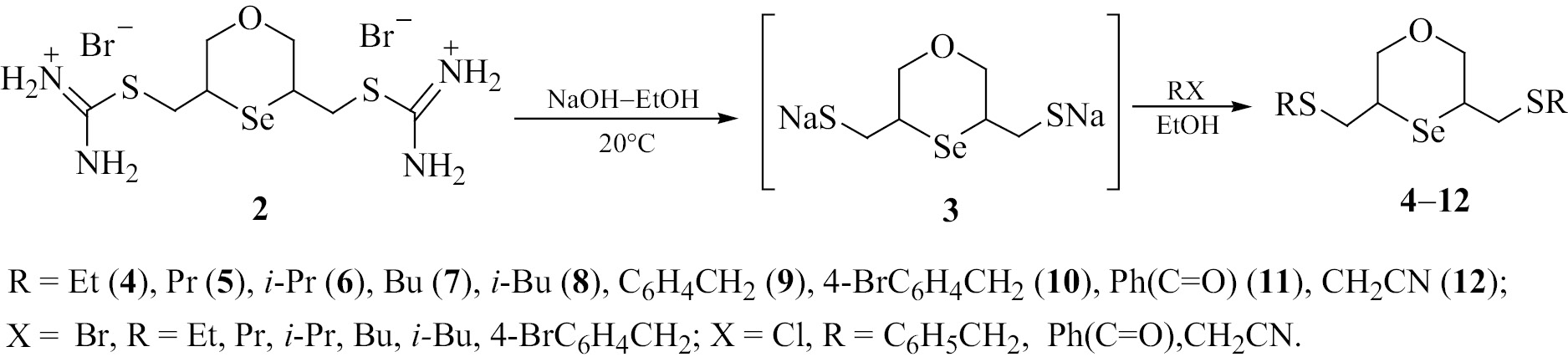 На основе дибромида бисизотиурония 2 осуществлен синтез большого количества функциональных производных оксаселенана. Разработан способ получения бис(органилсульфанилметил)-1,4-оксаселенанов, который основан на разложении бисизотиурониевой соли в щелочной этанольной среде в присутствии органилгалогенидов. В результате щелочного гидролиза бисизотиурониевой соли 2 происходит генерирование in situ соответствующего дитиолата натрия 3, который вступает в реакцию с находящимися в реакционной смеси органилгалогенидами (cхема 2).