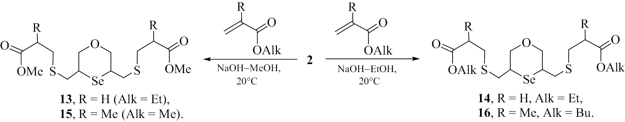 Реакция бис-изотиурониевой соли 2 с акрилатами. Раствор акрилата (1.1 ммоль) в спирте (метаноле или этаноле, 1 мл) добавляли к раствору диизотиурониевой соли 2 (0.25 г, 0.5 ммоль) в спирте (4 мл). Затем по каплям добавляли раствор гидроксида натрия (80%, 0.1 г, 2 ммоль) в спирте (4 мл) и смесь перемешивали в течение 15 ч. После удаления большей части спирта, добавляли воду (15 мл) и экстрагировали СН2Cl2 (3×15 мл). Органическую фазу сушили СаCl2. Растворитель отгоняли, остаток сушили в вакууме.