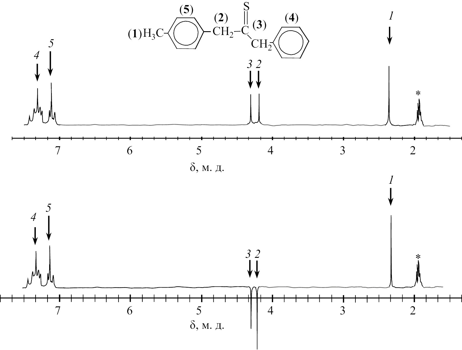Рис. 1. Спектры ЯМР 1Н исходного тиона в d-ацетонитриле: (а) темновой спектр; (б) при фотолизе, одна вспышка лампы. 1 – сигнал СН3 (2.34 м. д.); 2 – сигнал СН2 толилметильной группы (4.18 м. д.); 3 – сигнал СН2 бензильной группы тиона (4.28 м. д.); 4 – сигнал ароматических протонов бензильной группы (7.29 м. д.); 5 – сигнал ароматических протонов толилметиленовой группы (7.15 м. д.); * – сигнал растворителя.