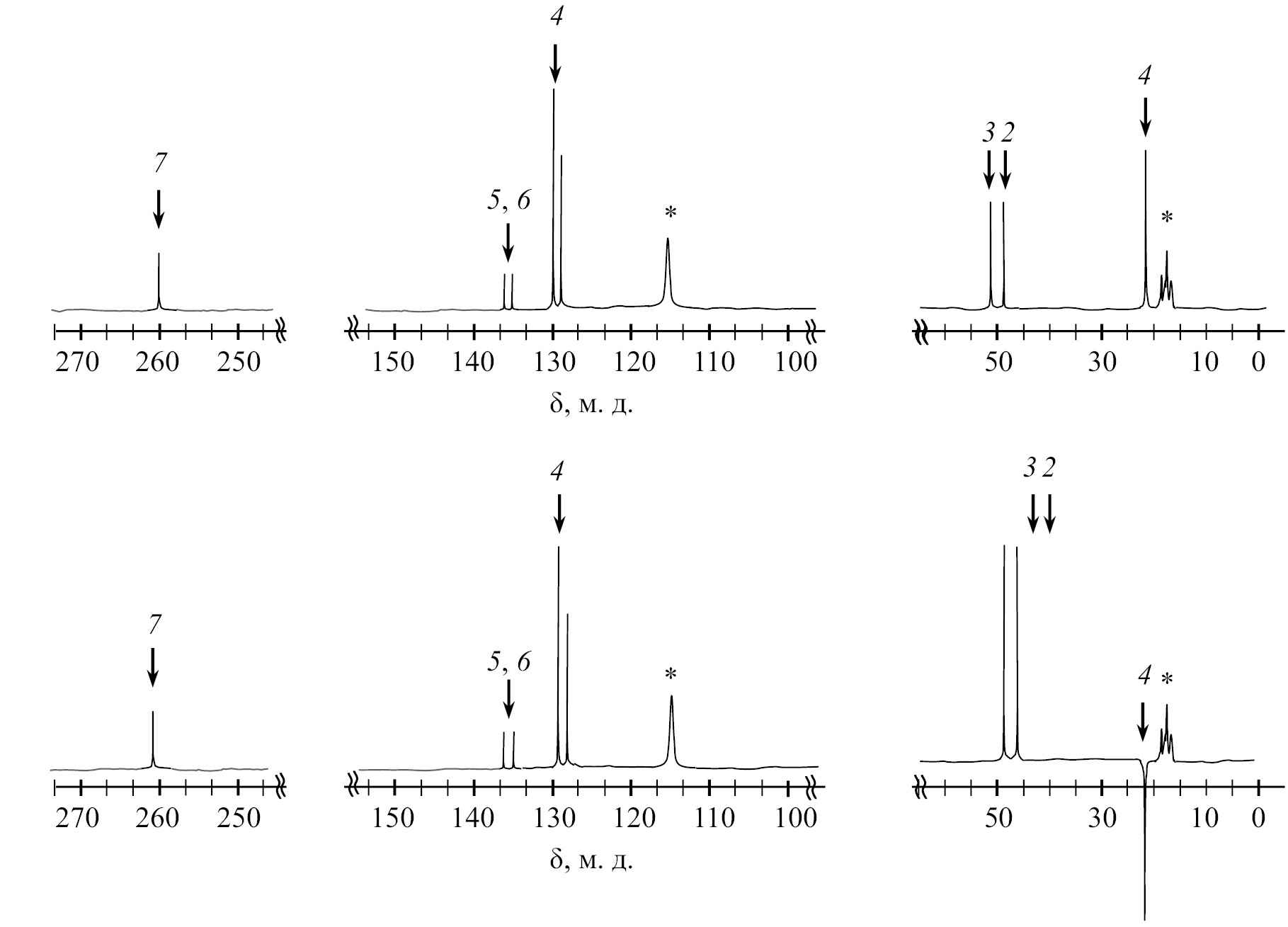 Рис. 2. Спектр ЯМР 13С исходного тиона в d-ацетонитриле: (а) темновой спектр; (б) при фотолизе одной вспышке лампы. 1 – сигнал СН3 (21.46 м. д.); 2 – сигнал СН2 толилметиленовой группы (47.3 м. д.); 3 – сигнал СН2 бензильной группы тиона (48.6 м. д.); 4 – сигнал углерода ароматической группы (127–129 м. д.); 5, 6 – сигнал четвертичных углеродов (135.99, 137.45 м. д.); 7 – сигнал С=S; * – сигнал растворителя.