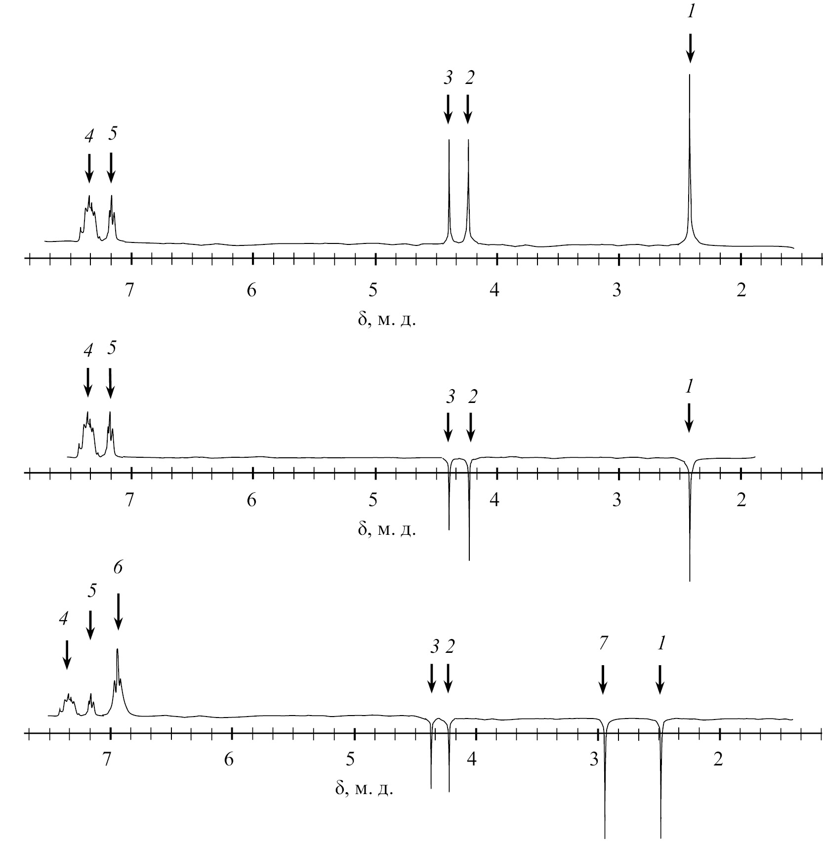 Таким образом, химическая поляризация ядер формируется при синглет-триплетных переходах в триплетных радикальных парах внутри клетки растворителя, знаки констант СТВ на этих группах и величины g-факторов определяют знаки поляризации ядер в регенерируемом тионе. В образующихся вне клетки растворителя дибензилах 4–6 знаки поляризации на этих группах обратные. Зарегистрированы три типа дибензилов: СН3С6Н4СН2СН2С6Н4СН3 (4), СН3С6Н4СН2СН2Ph (5), РhСН2СН2Ph (6).