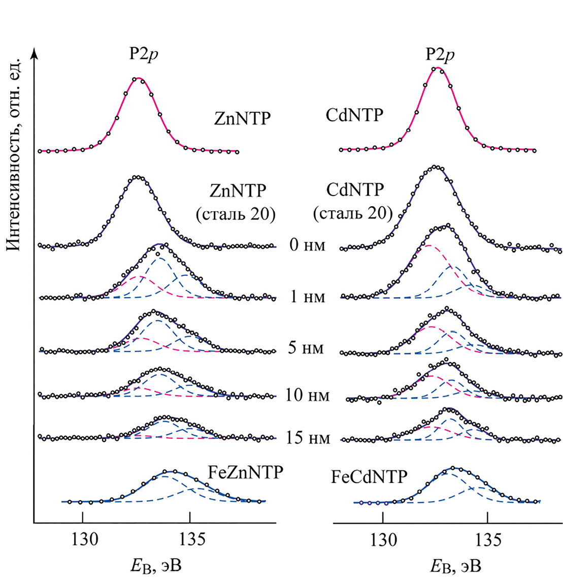 Связи, формирующие характерную структуру ближнего окружения атомов фосфора в соединениях FeZnNTP и FeCdNTP, являются сравнительно прочными. Энергия разрыва для связи P–C составляет 513±8 кДж/моль, для связи P–O – 596±6 кДж/моль, для связи Fe–O – 409±13 кДж/моль; менее прочными являются связи Zn–O – 284±14 кДж/моль и Cd–O – 142±42 кДж/моль [35]. Все же энергия разрыва этих связей значительно меньше, чем энергия ионов Ar+, используемых для травления оксидно-гидроксидных слоев на поверхности стальных образцов (в настоящей работе для травления использовали ионы Ar+ с энергией 1000 эВ). Тем не менее проверка, проведенная на индивидуальных образцах соединений ZnNTP, CdNTP, FeZnNTP и FeCdNTP, показала что при травлении ионами ионами Ar+ с энергией 1000 эВ сохраняется характерная для исходных соединений структура спектров (рис. 1г–ж), позволяющая идентифицировать эти соединения в качестве исходных веществ и продуктов реакций (1) и (2). По-видимому, это объясняется сложным характером переноса в поверхностном слое энергии, рассеиваемой ионом Ar+ при соударении с поверхностью, и уносом части энергии фрагментами разрушаемого слоя поверхности; при этом РФЭ-спектр протравленной поверхности формируется молекулярными структурами, лежащими на глубине до 5 нм [34], которые не подверглись разрушению ионами Ar+.