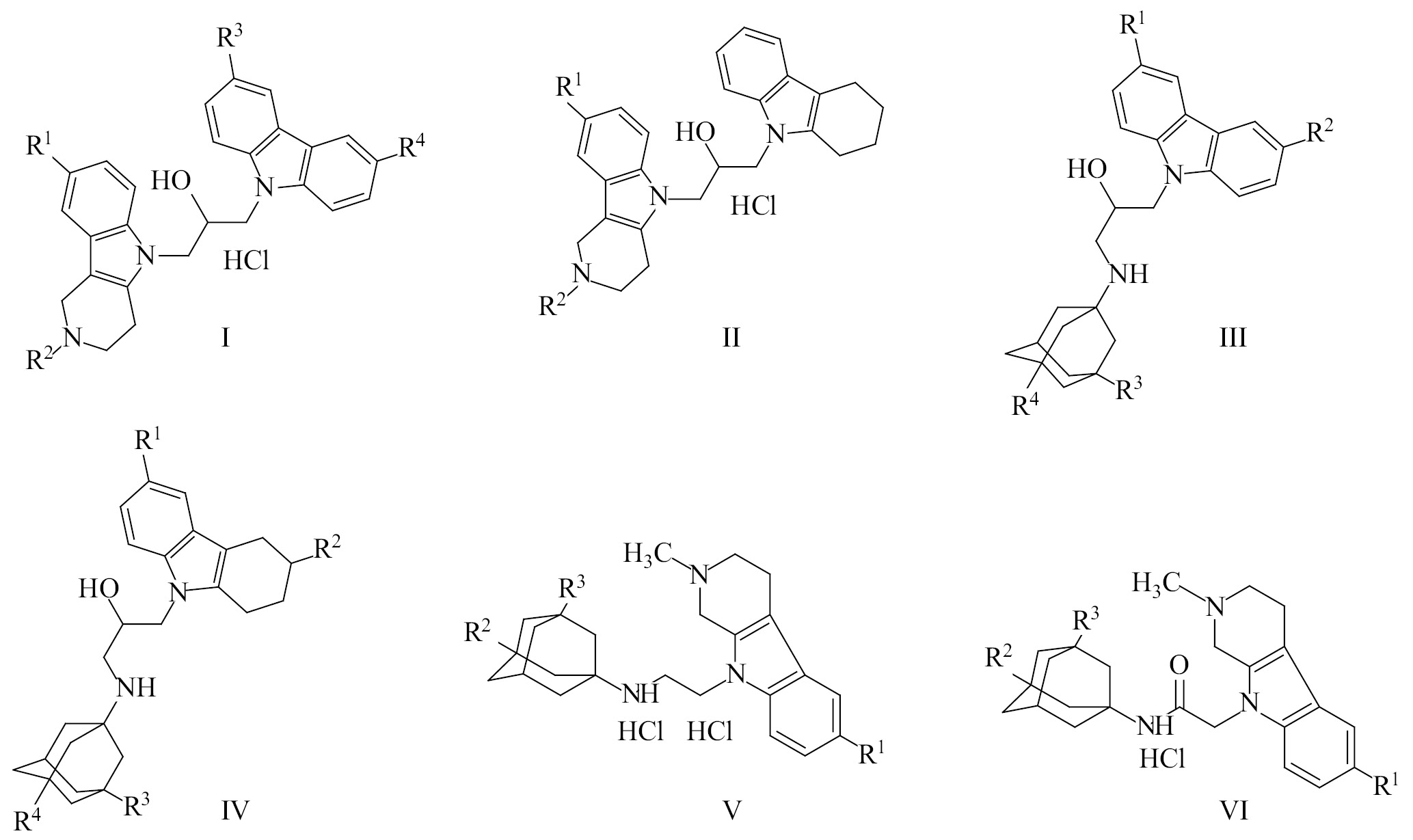 Исследуемые соединения содержат по две фармакофорные группы, соединенные различными молекулярными спейсерами. Всего исследовано шесть рядов бифармакофорных соединений, включающих в себя конъюгаты γ-карболинов с производными карбазола (I) и тетрагидрокарбазола (II), конъюгаты аминоадамантанов с производными карбазола (III) и тетрагидрокарбазола (IV) и конъюгаты аминоадамантанов с γ-карболинами (V, VI). Для увеличения статистической значимости результатов исследования введем некоторые допущения: (1) будем рассматривать карбазолы и тетрагидрокарбазолы в качестве одной фармакофорной группы; (2) будем считать, что все фармакофорные группы соединены с помощью одного и того же молекулярного спейсера. С учетом вышесказанного общее число фармакофорных групп, а также число их парных комбинаций будет равно 3. Для создания QSAR моделей активности использовали три комбинации соединений: I+II, III+IV и V+VI, каждая из которых содержала две фармакофорные группы. Общая идея симуляции рационального межклассового прогноза активности бифармакофорных соединений состояла в конструировании QSAR модели с использованием обучающего ряда, включающего 1 или 2 комбинации соединений, и предсказании на ее основе активности для других комбинаций соединений.