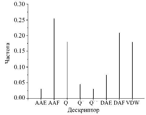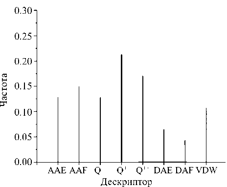 В табл. 2 приведены статистические параметры моделей при использовании стратегии МПА-1. Следует отметить, что не все примененные алгоритмы обеспечивают получение удовлетворительных QSAR моделей. В частности, метод случайного леса показывает худший результат, поэтому он не использовался для межклассового прогноза активности. Для выявления значимости дескрипторов был проведен расчет частоты их появления при проведении МПА-1 (рис. 3). При этом можно отметить, что наиболее часто в качестве независимых переменных в QSAR моделях фигурируют AAF и DAF дескрипторы. Это может свидетельствовать о том, что при использовании стратегии МПА-1 наиболее значимыми внутримолекулярными парными атомными взаимодействиями являются взаимодействия типа Н-акцептор–Н-акцептор и Н-донор–Н-акцептор. Среди AAF дескрипторов наиболее часто встречается дескриптор 143, при этом он изменяется в пределах от 0.000 до 0.122. Минимальное и максимальное значение наиболее значимого DAF дескриптора 634 составляет 0.000 и 0.674 соответственно.