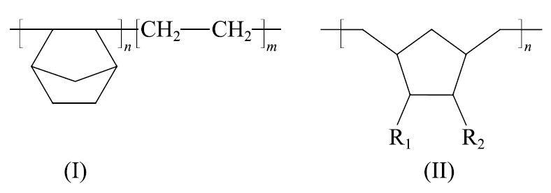 Координационная полимеризация олефинов, катализируемая комплексами переходных металлов, является востребованным промышленным процессом. По сравнению с процессами радикальной полимеризации олефинов данный процесс характеризуется высокой степенью контроля над составом полимерных продуктов, их структурой и свойствами. В частности, возможность контролируемого введения полярных групп в структуру полиолефинов позволяет добиться существенного улучшения характеристик продуктов полимеризации, таких как ударная вязкость, гибкость, газопроницаемость, адгезия, смешиваемость и др. Одним из активно применяемых подходов к регулированию свойств полиолефинов является сополимеризация этилена с напряженными циклоалкенами (в частности, норборненом) и их производными. С одной стороны, полярные группы в структуре напряженных циклоалкенов удалены от полимеризуемой двойной связи, что снижает негативное влияние полярных заместителей в структуре мономеров на процесс полимеризации и дает возможность контролировать долю полярных групп в структуре полимеров. С другой — введение циклических фрагментов в основную цепь приводит к образованию полимеров с высокими температурами стеклования, повышенной термической стабильностью, большей устойчивостью к действию растворителей, а также высокой прозрачностью [1]. Коммерческие продукты (I) и (II) на основе сополимеров этилена с норборненом находят широкое применение благодаря совместимости с существующими полимерными материалами (например, полиэтиленом и полипропиленом), а также благодаря возможности применения классических технологий обработки полимеров (экструзия, литье под давлением, компрессионное формование и др.). Такие сополимеры используются в качестве материалов для пищевой упаковки, медицинских изделий, оптических пленок и др. [2, 3].
