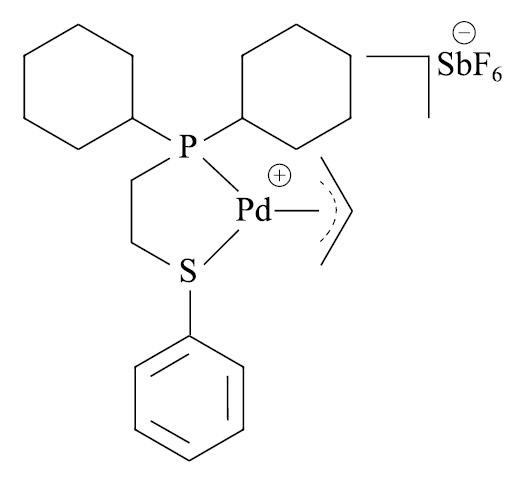 Синтез катионного аллильного комплекса палладия с (2-фенилтиоэтил)дициклогексилфосфином. Выход 82%.