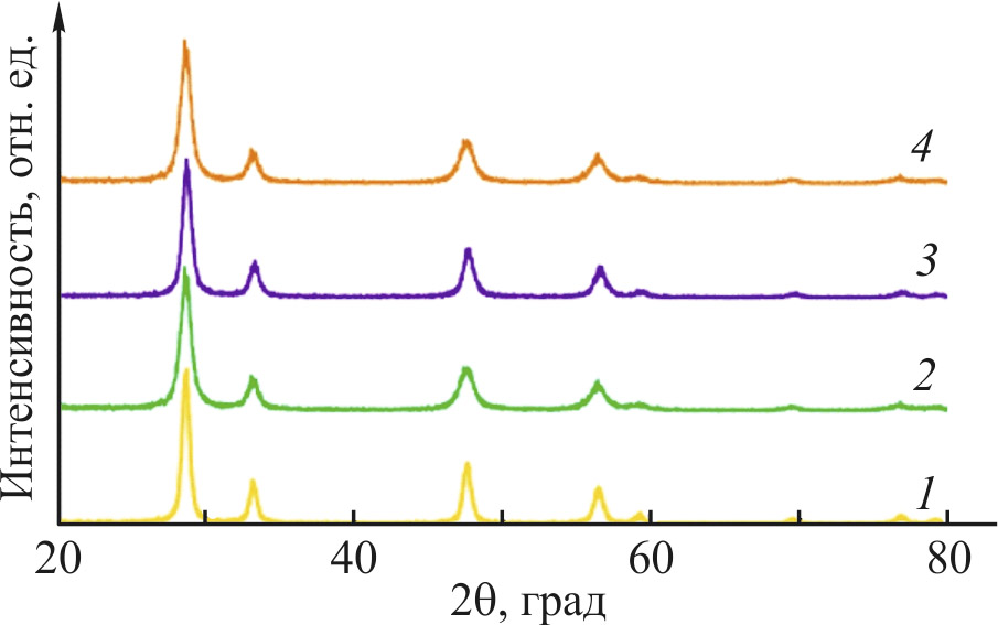2. Рис. 1. Рентгенограмма синтезированных образцов. 1 — CeO2, 2 — Ce0.85Zr0.10La0.05O2–δ, 3 — Ce0.85Zr0.10Nd0.05O2–δ, 4 — Ce0.85Zr0.10Gd0.05O2–δ.