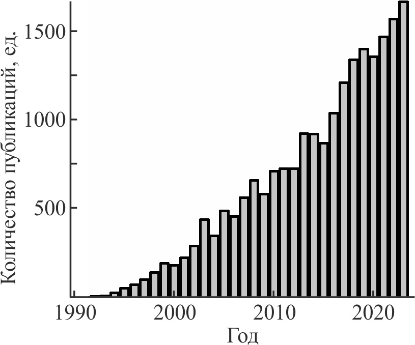 Рис. 1. Количество публикаций по функционально-градиентным материалам в период 1990–2023 гг. (по результатам поиска в Scopus).