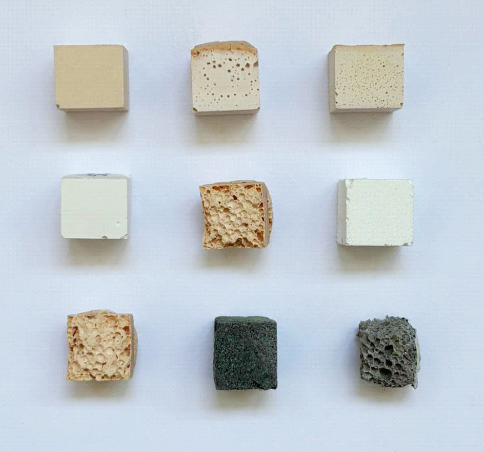 Рис. 1. Геополимерные материалы, полученные на основе природного каолинита, бентонита, золы уноса и синтетического каолинита (материалы авторов).