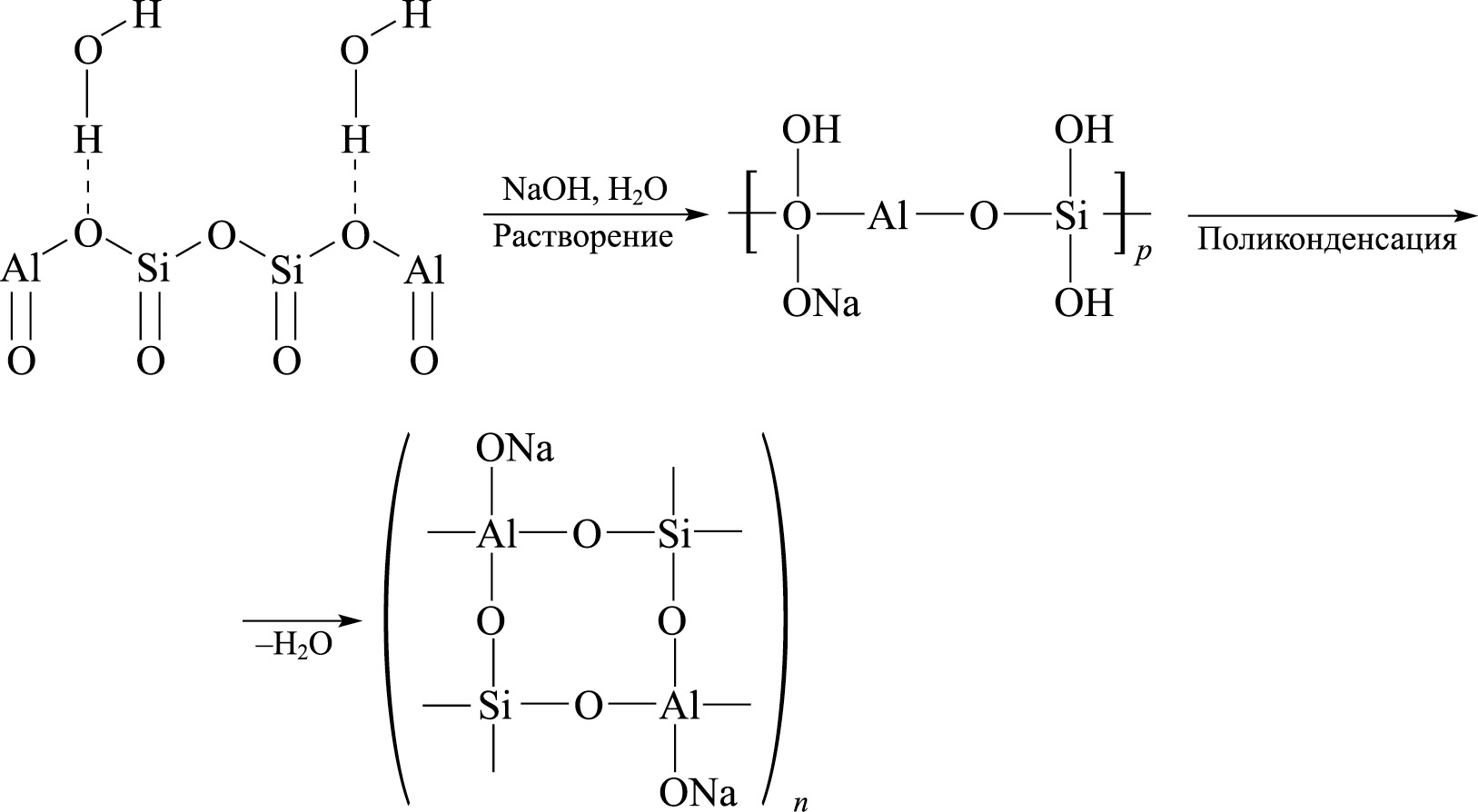Стадии процесса геополиконденсации протекают параллельно, поэтому существуют определенные сложности при их дифференциации и изучении [42–44, 51]. На схеме (II) приведены основные стадии образования геополимерной матрицы. (II)
