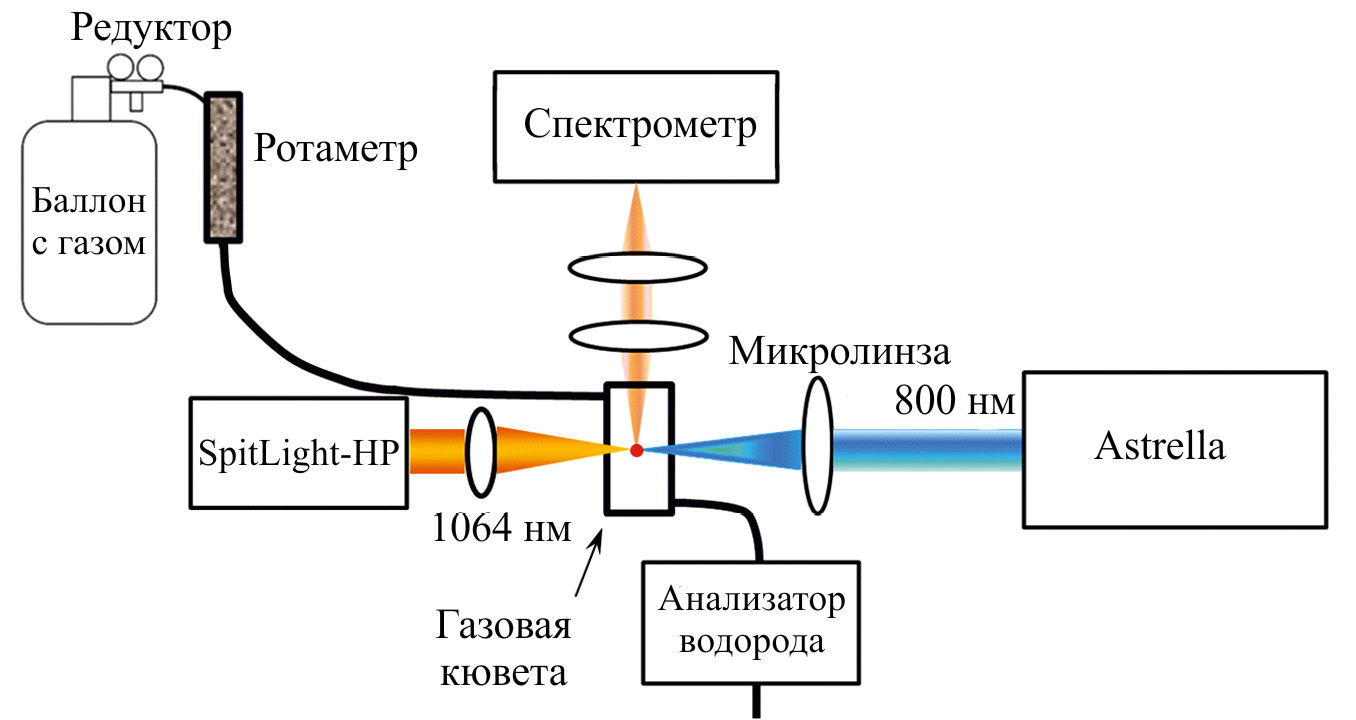 Для разложения в лазерной плазме использовался пропан 3.0, поставляемый ООО «БК Групп». Блок-схема приборного комплекса, использовавшегося для проведения исследования, приведена на рис. 1.