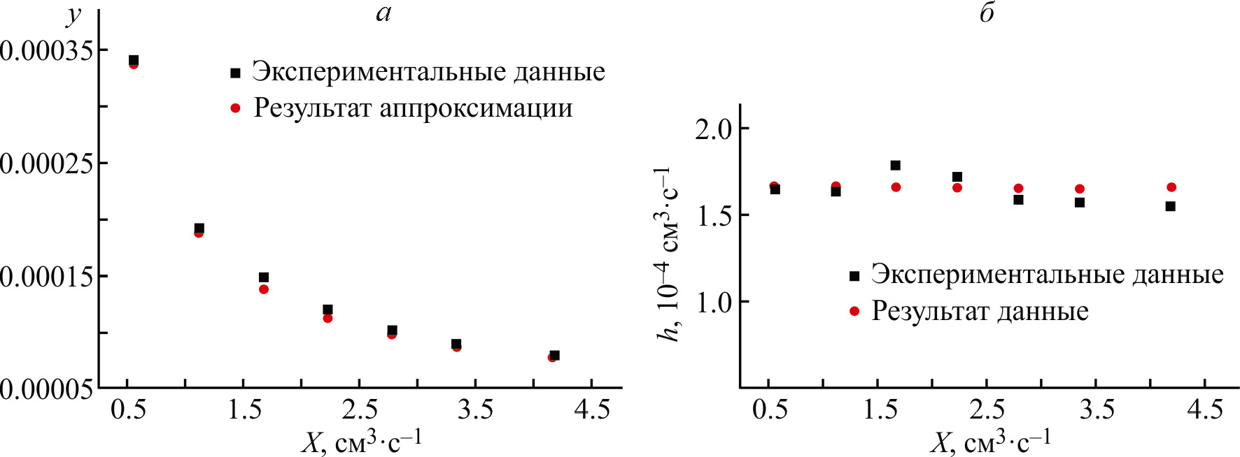 По результатам аппроксимации а = 0.000039. Параметр h0, рассчитанный из зависимости, приведенной на рис. 2, а, составляет 0.167·10–3 см3·с–1. Из экспериментальной зависимости y(Х) рассчитана зависимость h(Х) (рис. 2, б). Величина h не зависит от X и близка к h0 (две выпавшие из общей закономерности экспериментальные точки отклоняются от значения h0 не более чем на 10%). Это означает, что за короткое время действия импульса количество образующегося водорода мало, и эффективность его генерации существенно не снижается. Следовательно, выбранное приближение корректно.