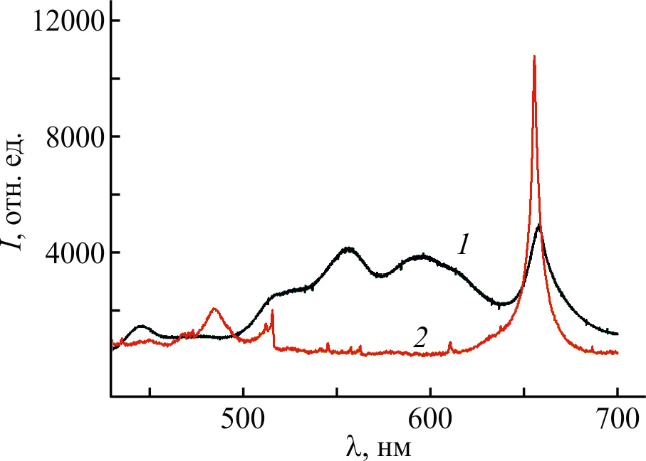 Рис. 3. Зависимости интенсивности свечения плазмы под действием импульсов длительностью 35 фс (1) и 7 нс (2) от длины волны ее излучения.