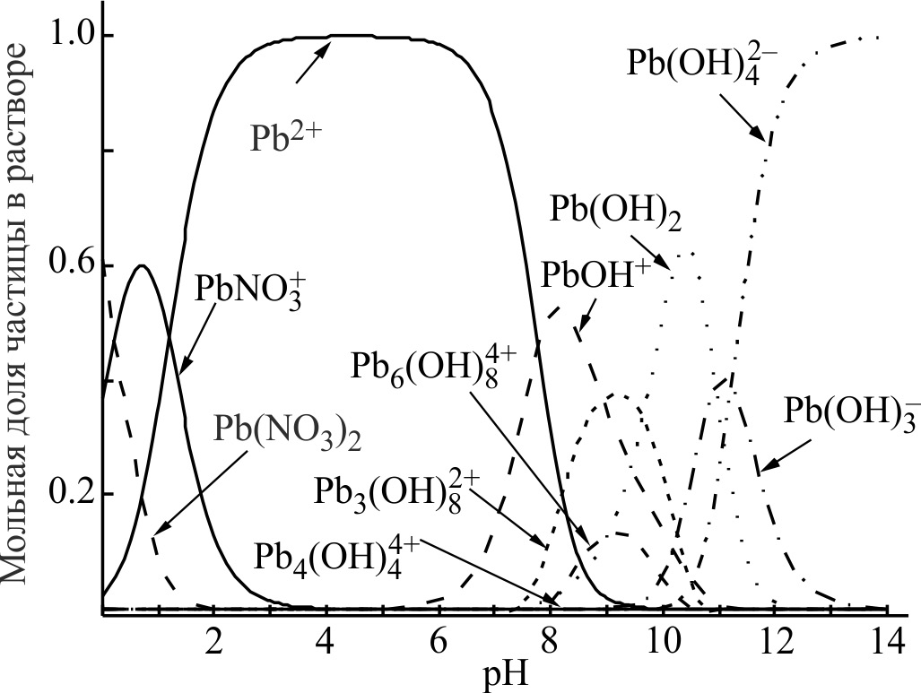 Рис. 2. Зависимость мольной доли свинецсодержащих частиц от рН раствора.