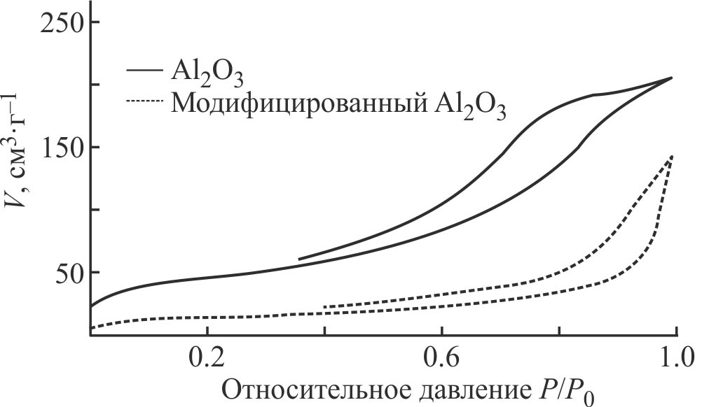 Изотерма низкотемпературной адсорбции–десорбции азота Al2O3 относится к IV типу с H петлей гистерезиса (IUPAC), 4 что свидетельствует о выраженной мезопористой структуре порового пространства, сформированного глобулярными частицами (рис. 1). Изотермы гидротермально модифицированного Al2O3 и катализатора относятся к III типу с H петлей гистерезиса (IUPAC) соответственно, мезопористая структура их порового пространства в основном формируется щелевидными порами между плоскопараллельными частицами (рис. 1).