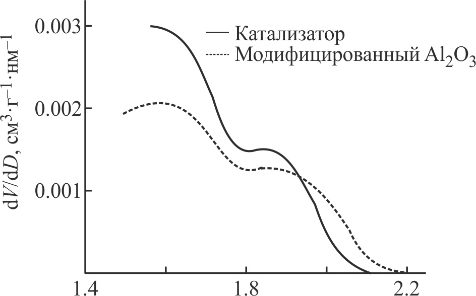 Трансформация пористой структуры катализатора по сравнению с гидротермально модифицированным Al2O3 характеризуется снижением объема мезопор диаметром свыше 10 нм при увеличении объема мезопор в области диаметров 2–5 и 5–10 нм (табл. 2). Вероятная причина — частичное заполнение пор диаметром более 10 нм каталитически активным компонентом.