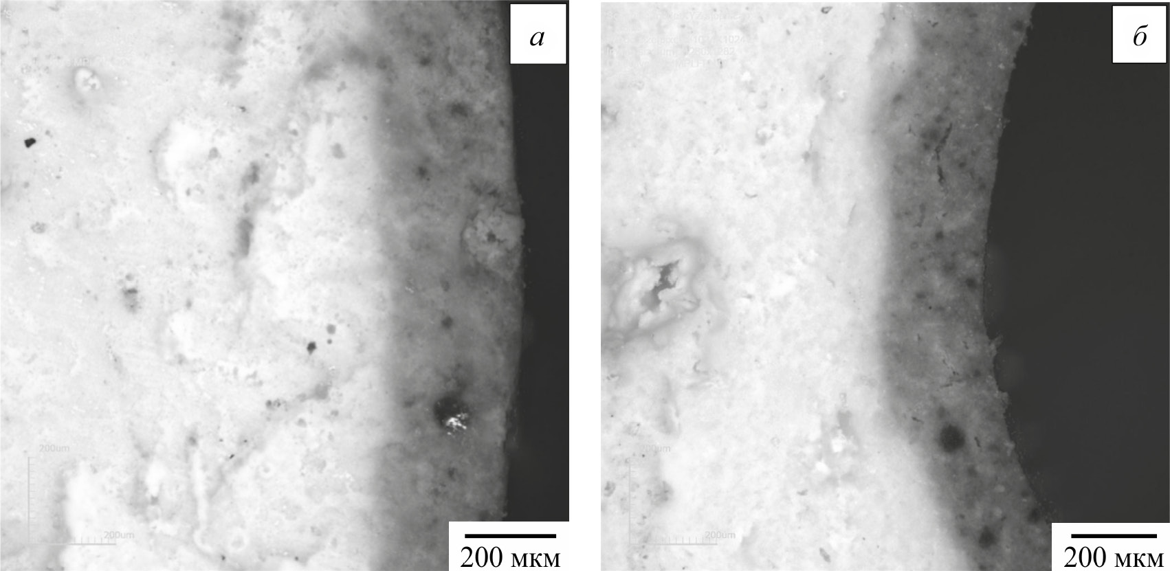 На качественном уровне соизмеримые значения глубины проникновения Pd в объем гранулы катализатора 160–200 мкм получены по результатам локального энергодисперсионного спектрометрического анализа (рис. 4). Количественно независимо от глубины проникновения каталитически активного компонента со стороны наружной и внутренней поверхности кольца гранулы концентрация Pd в приповерхностной области гранулы в ~3 раза выше, чем на границе его проникновения в объем гранулы.