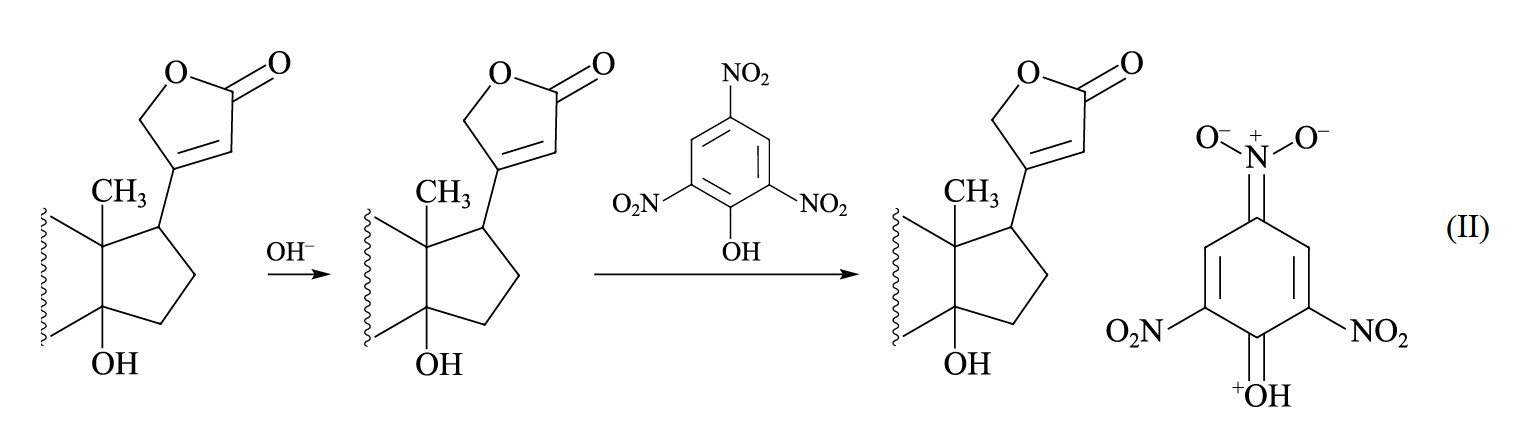 Спектрофотометрия в видимой и ультрафиолетовой областях спектра. В основе фотометрического метода определения СГ ландыша лежит специфическая реакция взаимодействия карденолидов с полинитросоединениями в щелочной среде — реакция Балье (II).1 В данных условиях СГ ландыша в результате взаимодействия с пикриновой кислотой образуют окрашенные в оранжевый цвет продукты реакции, имеющие характерный спектр поглощения.