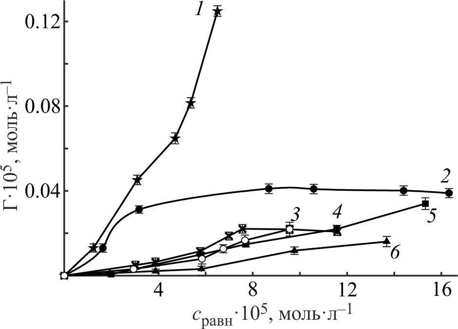 Рис. 1. Изотермы адсорбции на сульфидной медно-никелевой руде 4-(4-карбоксифенилазо)нафтола-1 (1), 4-(4-сульфофенилазо)нафтола-1 (2), 1-(4-сульфофенилазо)нафтола-2 (3), 2-(3-карбоксифенилазо)-п-крезола (4), 4-(4-карбоксифенилазо)фенола (5) и 2-(4-карбоксифенилазо)-п-крезола (6).