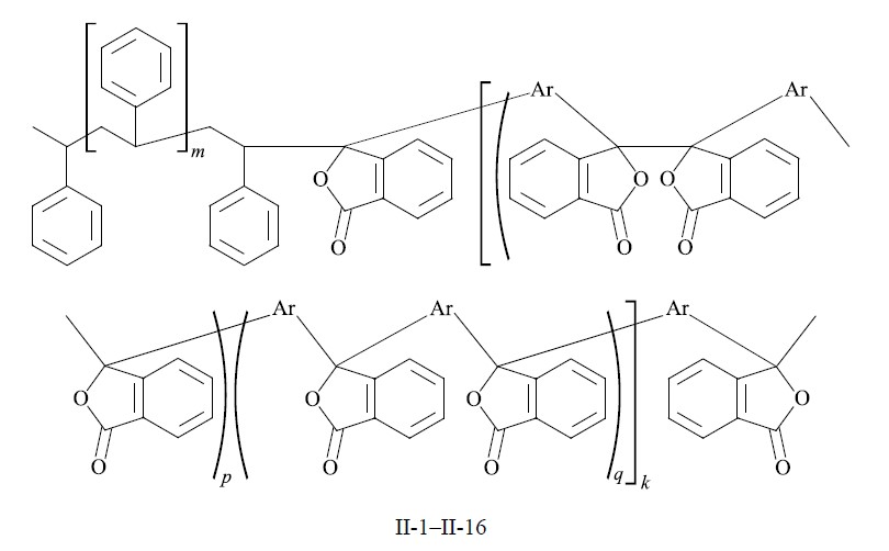c — сополимеры II-1–II-16 получены радикальной полимеризацией стирола в присутствии сополиариленфталидов I-1–I-12 и имеют следующую общую структуру: