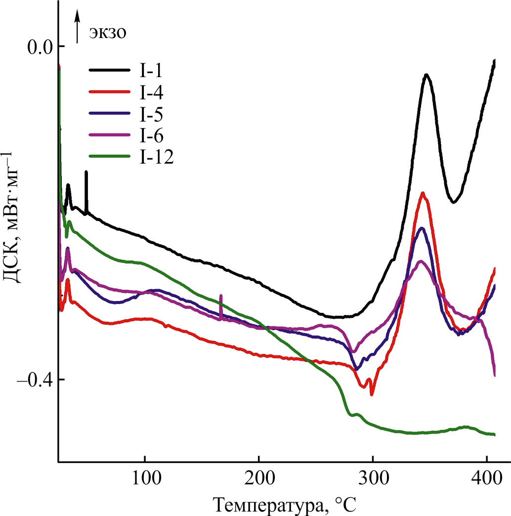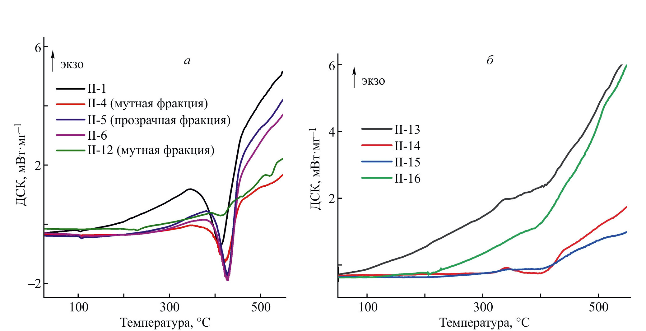 На кривых дифференциальной сканирующей калориметрии всех сополимеров II-1–II-16 в отличие от исходных полимеров I-1–I-12 отсутствуют эндотермические перегибы в области 270°С, отвечающие температурам плавления сополиариленфталидов (рис. 3). Это означает, что, как и полистирол, сополимеры II-1–II-16 обладают аморфной структурой. Распаду их полистирольных блоков соответствует эндотермический пик в области 400°С. В области 350°С вид кривых теплового потока зависит от состава [соотношения (β + γ)/α] исходных сополиариленфталидов и соответственно от состава формирующихся в их присутствии ариленфталид-стирольных сополимеров. Так, в случае сополимера II-1 [в исходном полимере I-1 (β + γ)/α = 1] регистрируется четкий экзотермический пик с интенсивностью намного меньшей, чем в самом полимере I-1.