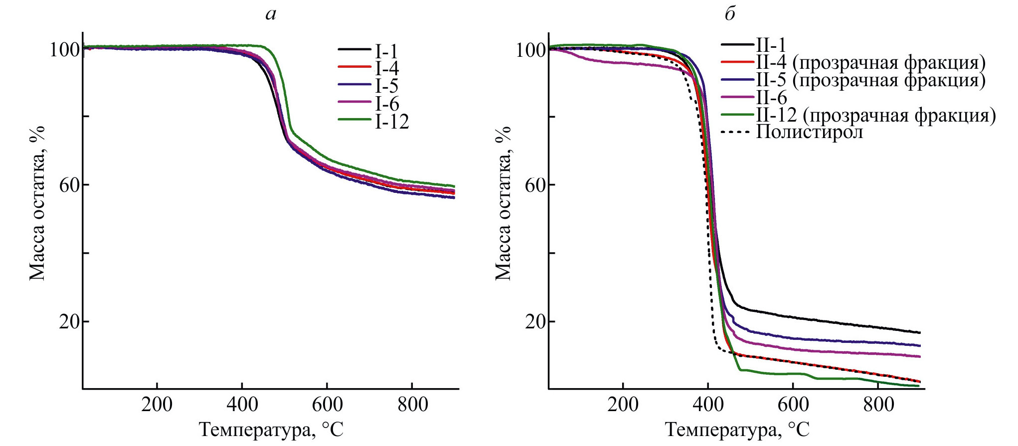 Данные термогравиметрического анализа сополимеров II-1–II-12 (рис. 4, б) полностью согласуются с результатами метода дифференциальной сканирующей калориметрии. Температура начала распада II-1–II-12 на 40–80°С выше, чем у полистирола. По мере увеличения содержания α-фталидных групп в составе исходного сополиариленфталида для сополимеров, формирующихся в гомогенных условиях (исключение — сополимер II-1), и сополимеров фракций А прослеживается снижение Тн.р; обратная закономерность, как и в случае самих I-1–I-12, характерна для сополимеров фракций Б (табл. 1, 2).