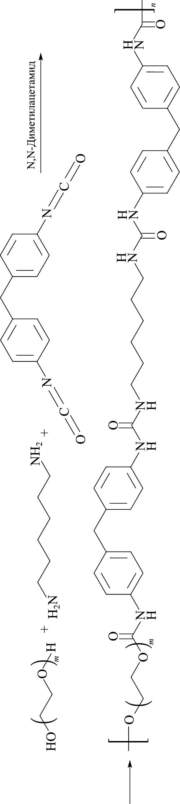 В колбу, снабженную подачей аргона, помещали 2.85 ммоль ПЭГ 1000, 5.7 ммоль метилендифенилдиизоцианата и 43.5 мл ДМАА (концентрация полимера составляла 10 мас%), перемешивали при 80°С 40 мин. Охлаждали реакционную смесь до комнатной температуры. Отдельно приготавливали раствор 2.28 ммоль гексаметилендиамина в 2 мл ДМАА при нагревании до 80°С. Раствор диамина прибавляли по каплям в реакционную смесь в течение 30 мин. После этого раствор нагревали до 80°С, перемешивали в течение 5 мин, охлаждали до комнатной температуры. Полученный полимер выделяли осаждением в дистиллированную воду, промывали дистиллированной водой (500 мл), метанолом (300 мл) и оставляли в нем на 1 ч. Сушили в термостате: 80°С — 3 ч; 160°С — 1 ч. Выход составил 81%.