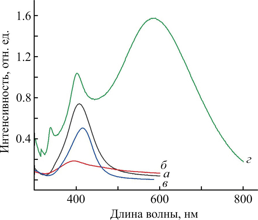 На спектрах поглощения коллоидных растворов наночастиц серебра присутствует характерный пик плазмонного резонанса в области 400 нм [14]. Максимальный пик фиксируется в случае цитратных и циклодекстриновых наночастиц серебра (рис. 1, а, в), что свидетельствует о достаточно высокой концентрации наночастиц. Пик плазмонного резонанса электроискровых наночастиц (рис. 1, б) имеет меньшую интенсивность, а также уширенное плечо, что может говорить о полидисперсности коллоидной системы [5]. Для треугольных наночастиц (рис. 1, г) на спектре поглощения появляется новая полоса поглощения в области 600 нм.