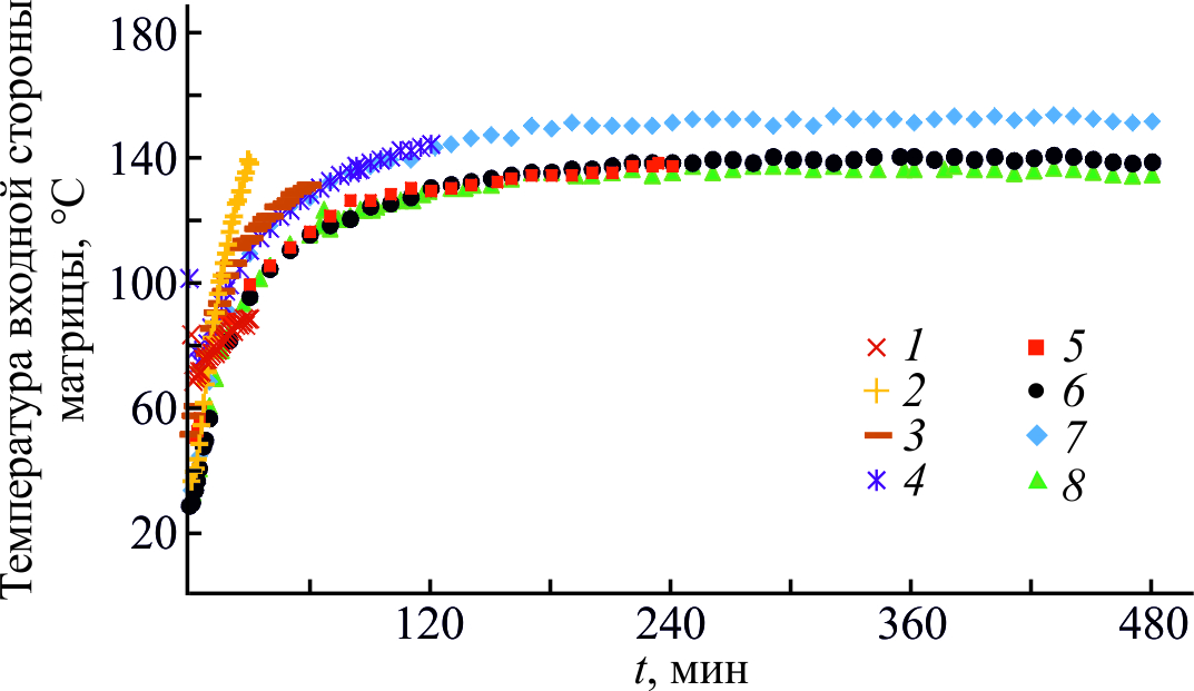 Рис. 3. Зависимость температуры входной стороны матрицы от времени проведения экспериментов.