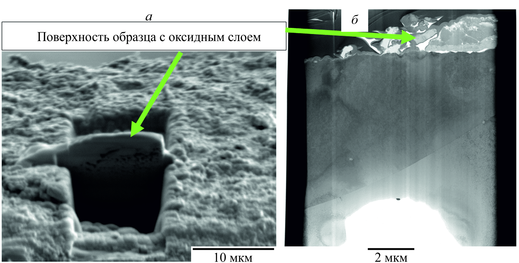 Рис. 8. Общий вид образца сплава системы Fe–Cr–Al после 2 ч эксплуатации в обогащенной кислородом среде, стрелкой показана область изготовления тонкой фольги (а); общий вид тонкой фольги в просвечивающем электронном микроскопе (б).