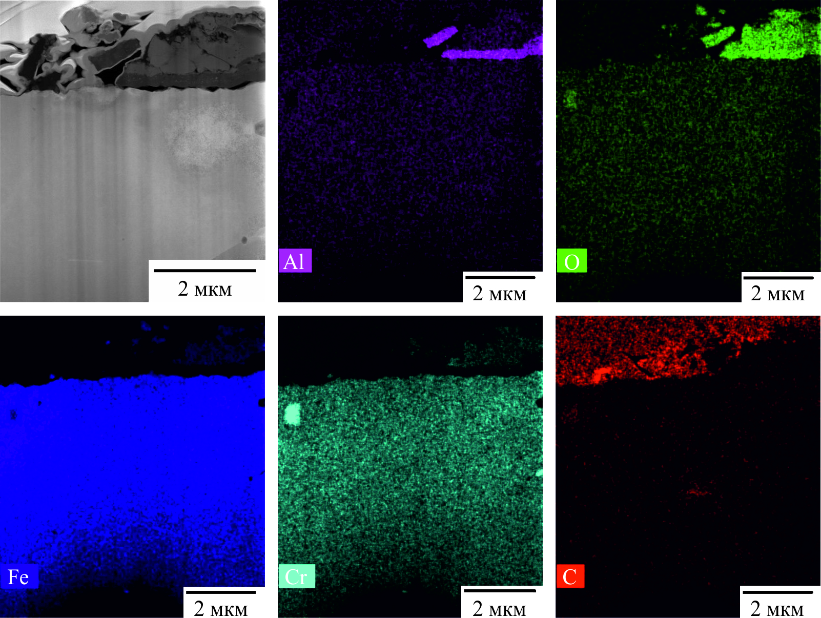 Рис. 9. Карты распределения алюминия, углерода, железа, хрома и кислорода.
