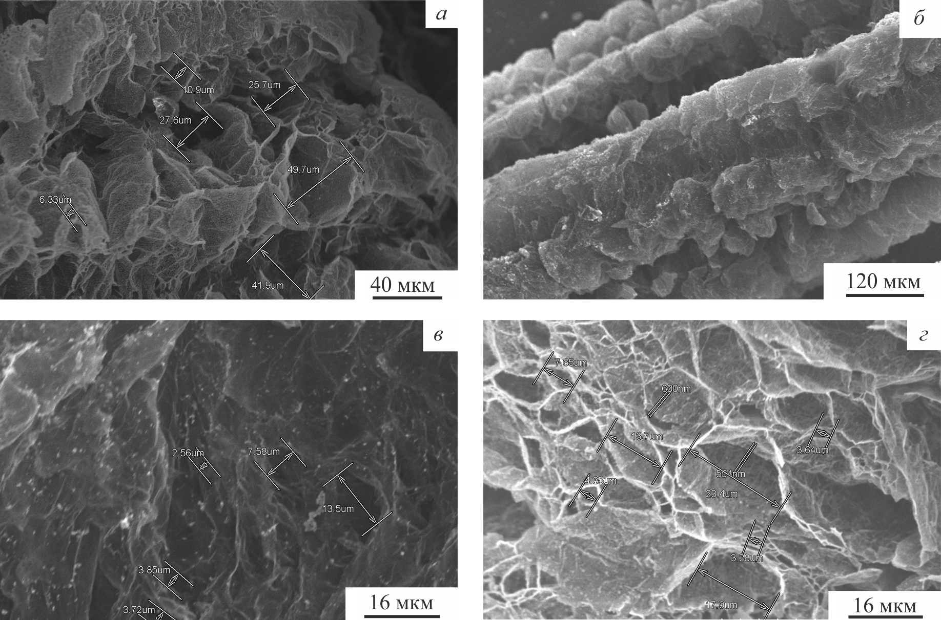 Согласно данным электронной микроскопии, структура терморасширенных графитов, полученных в составах с добавлением Fe2O3, Al2O3, SiO2, Cr2O3, является характерной для этого материала, «червячной» (рис. 1, а–г) [15]. Образцы терморасширенного графита, полученного с добавлением Fe2O3, характеризуются развитой рыхлой структурой поверхности, диаметр пор составляет 20–50 мкм (рис. 2, а). Для образцов терморасширенного графита, полученных с добавлением SiO2, характерна «позвонковая» структура с глубокими поперечными каньонами (рис. 2, б), морфология поверхности слоистая, аморфная, размер пор поверхности составляет 2–15 мкм (рис. 2, в), что в 2–3 раза меньше, чем в случае модифицирования Fe2O3. В случае с добавлением Cr2O3 морфология поверхности «сетчатая», на поверхности образца присутствуют два типа пор размером 3–10 и 20–30 мкм (рис. 2, г).