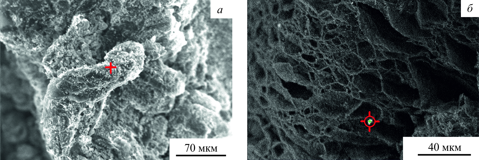 Рис. 4. Инородные включения на поверхности терморасширенного графита, модифицированного SiO2 (а) и Cr2O3 (б).