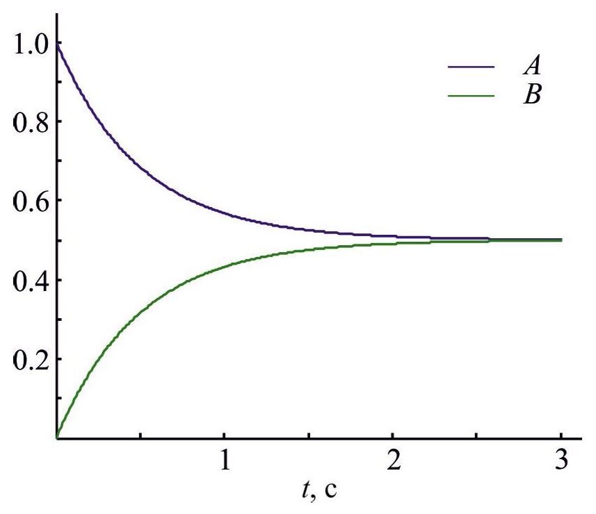 Динамика изменения концентраций реагентов реакции (1) для кинетики ЗДМ при k+ = k– = 1 и ε = 0.002 показана на рис. 1.