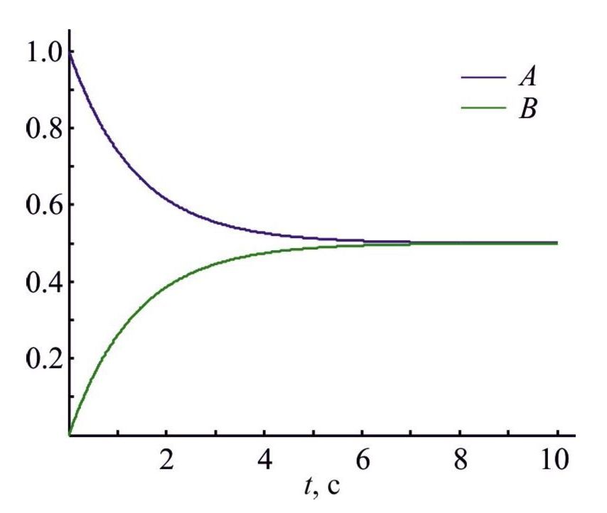 где A = A(t), B = B(t) — концентрации реагентов, безразмерные (б/р); t — время (c); r+, r– — скорости стадий в прямом и обратном направлениях при любом КЗ (1/с). В закрытом РИС в любой момент времени независимо от вида КЗ выполняется линейный стехиометрический закон сохранения (ЗС)
