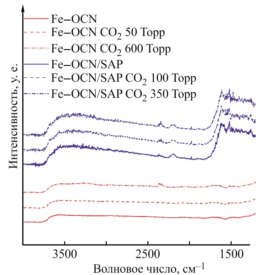 Рис. 6. ИК-спектры катализаторов Fe–OCN и Fe–OCN/SAP; SAP — сополимер акрилата натрия и акриламида; CO2N Торр — давление CO2 над поверхностью катализаторов, где N — значение давления (если давление не указано, то вакуум)