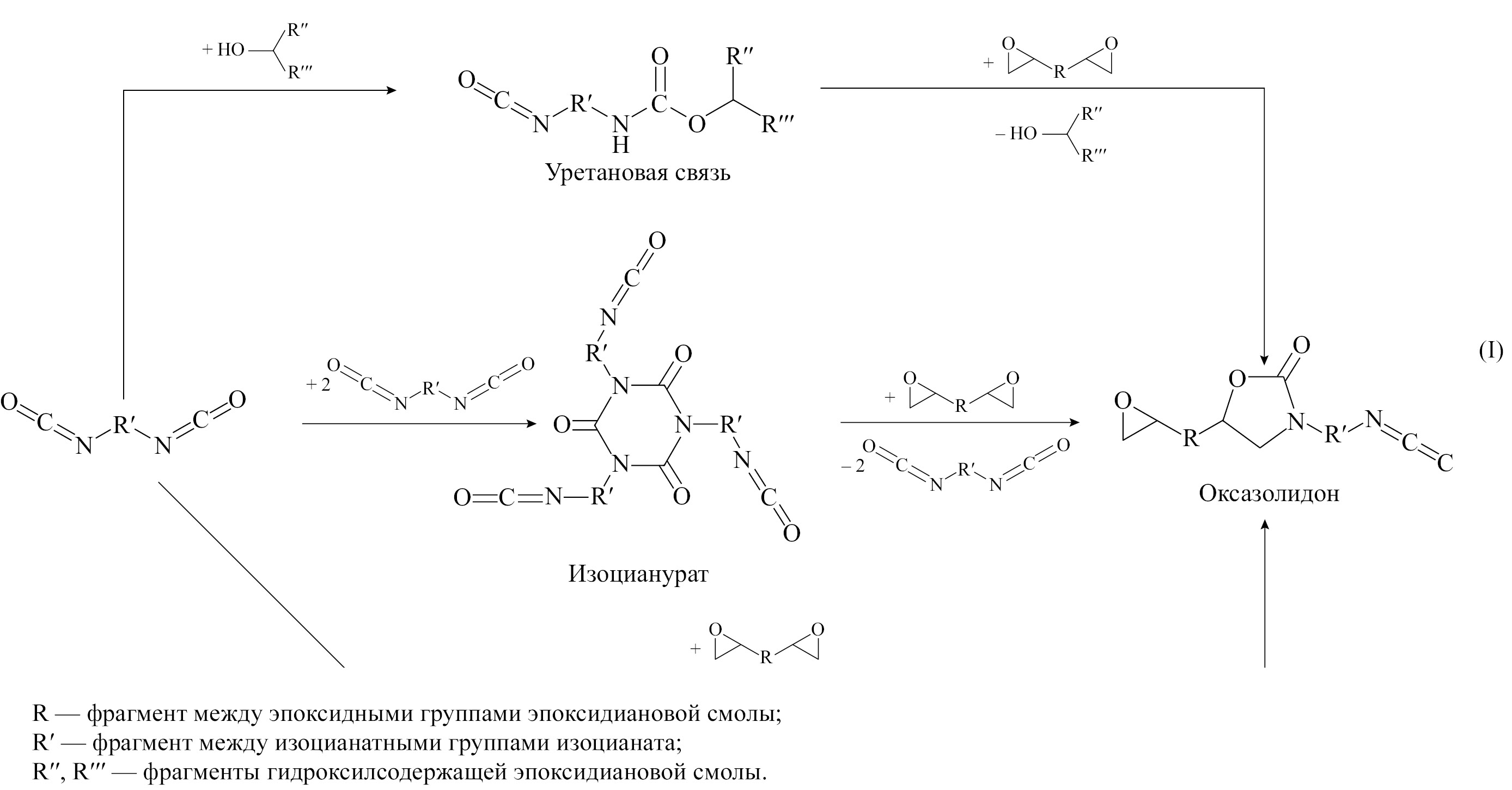 Трехмерное сшивание эпоксиизоцианатного связующего должно происходить в результате тримеризации полиизоцианата и формирования эфирных и уретановых связей, в то время как образование оксазолидоновых колец должно приводить к росту полимерной цепи и увеличению ее жесткости [9]. Структура формирующегося продукта представлена ниже: